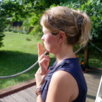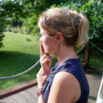 Asetu hyvään asentoon istumaan. Ota vasemmalla kädellä oikean käden ranteesta kiinni ja tuo oikean käden etu- ja keskisormi yhteen ja kiinni suupieleen. Oikea käsi ja sen kaksi sormea toimivat sinulle mittarina ja vasen käsi pitää sitä paikallaan.